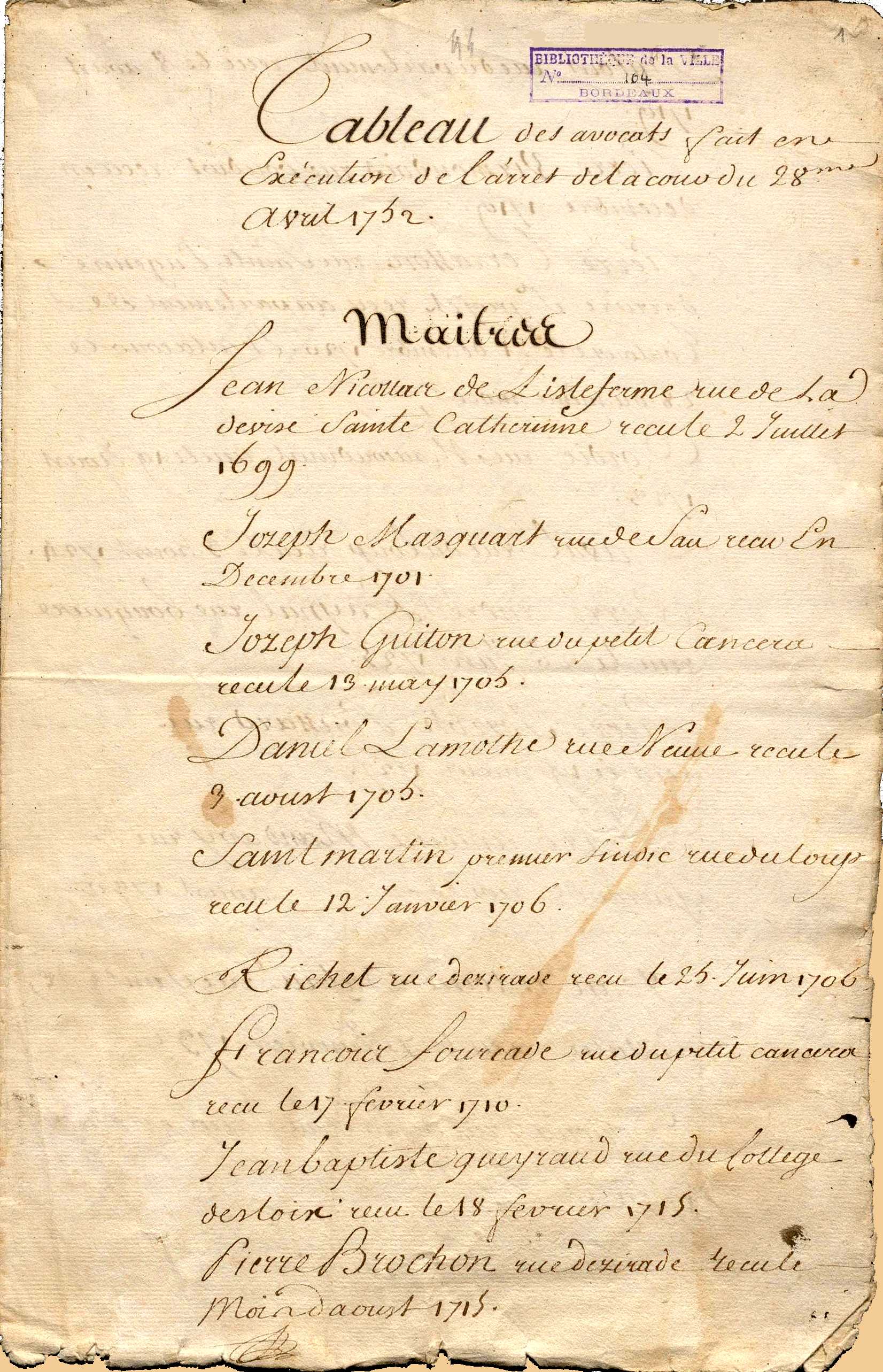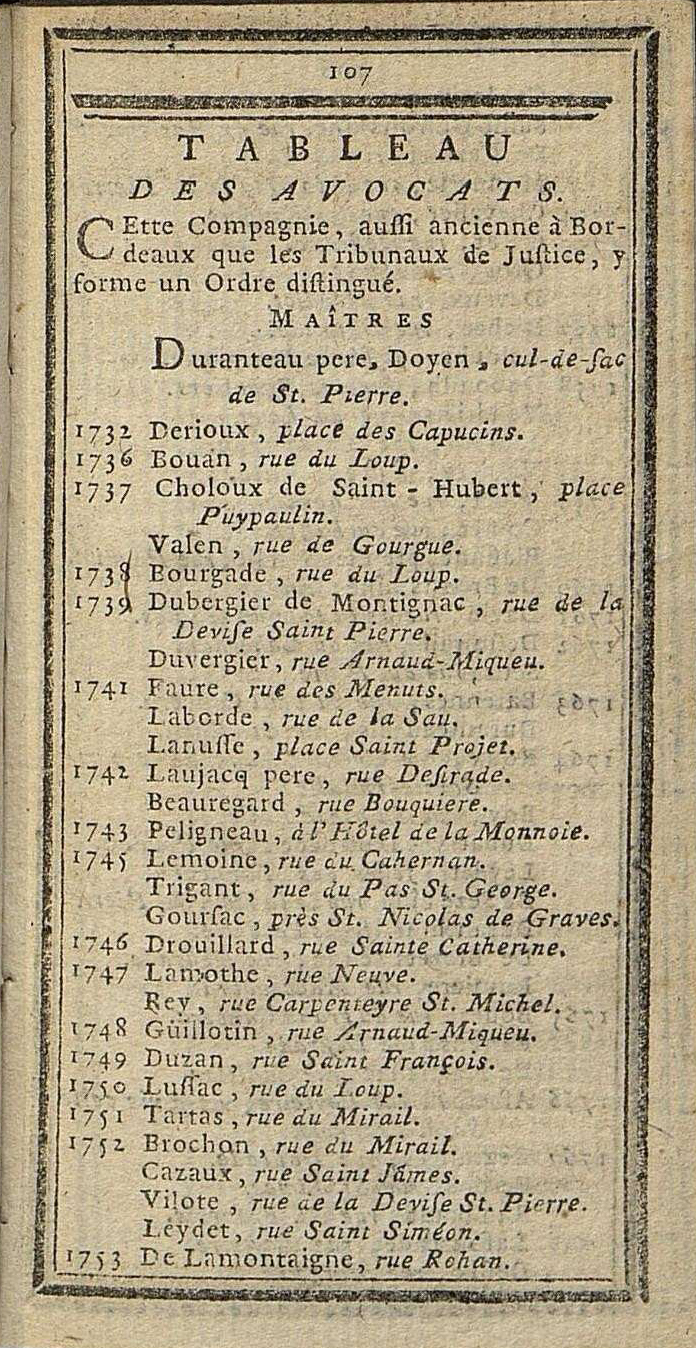 Jusqu'en 1790, la Compagnie des Avocats est déclarée aussi ancienne à Bordeaux que les tribunaux de justice et y former « un Ordre distingué ». 1802 1808